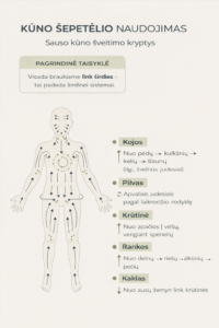 Šepetį naudojant ilgais judesiais širdies kryptimi, skatinama natūrali organizmo detoksikacija ir atsipalaidavimas.